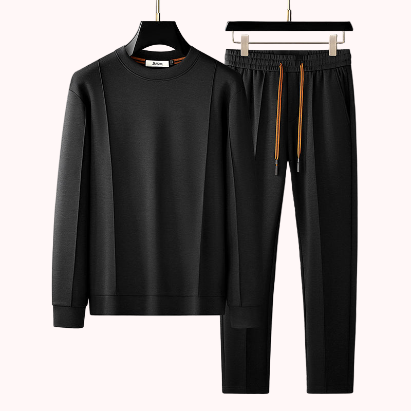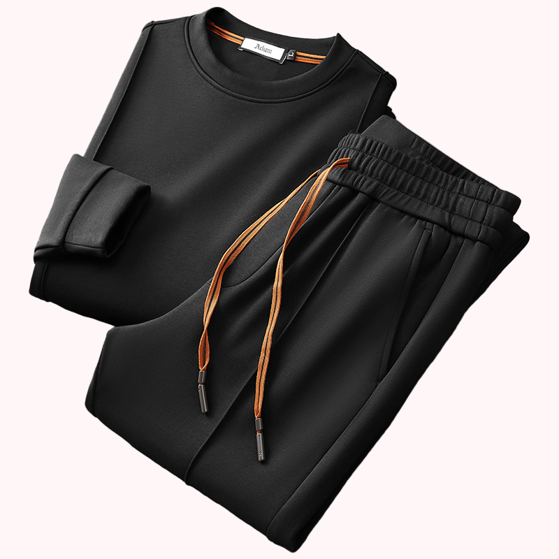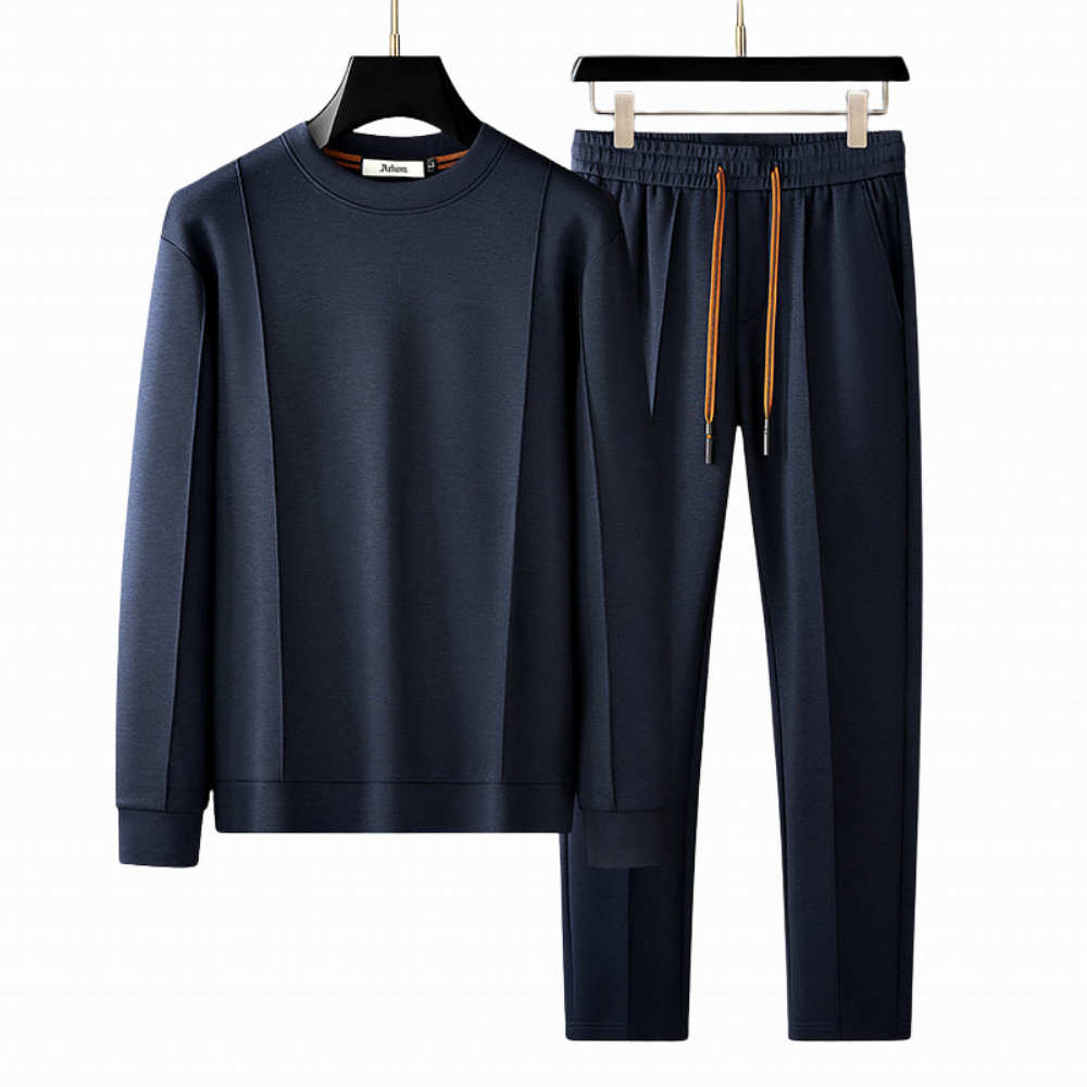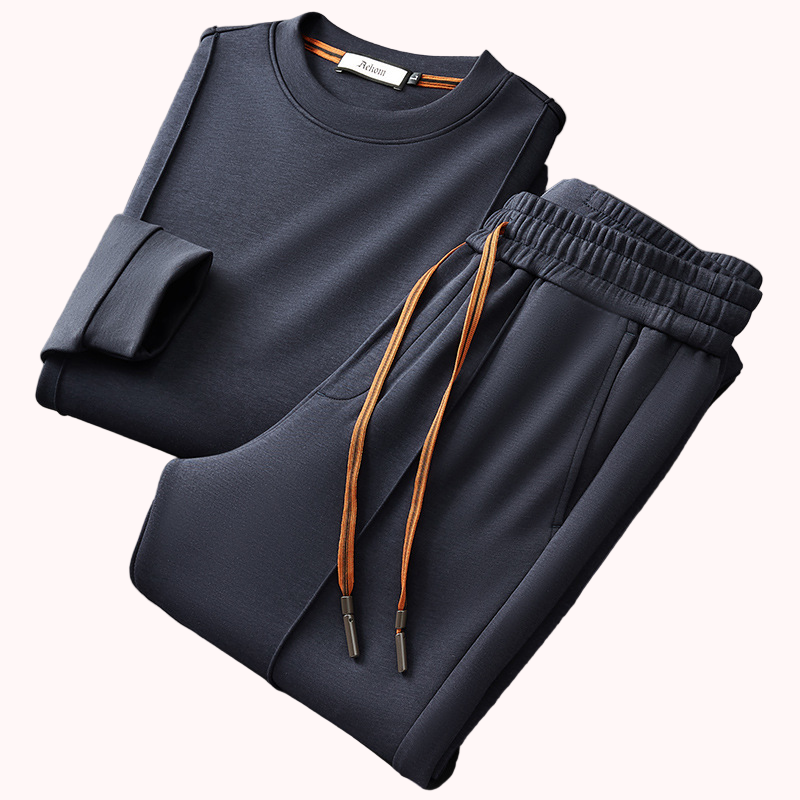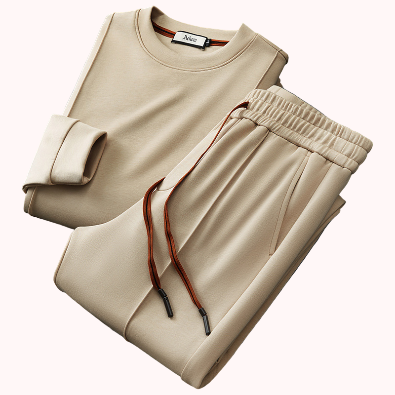 Confeccionado con una mezcla premium de algodón y seda, este conjunto redefine la comodidad con un acabado elegante. La sudadera de cuello redondo y el pantalón de corte recto ofrecen una sensación suave y transpirable que va más allá de la ropa de descanso tradicional.